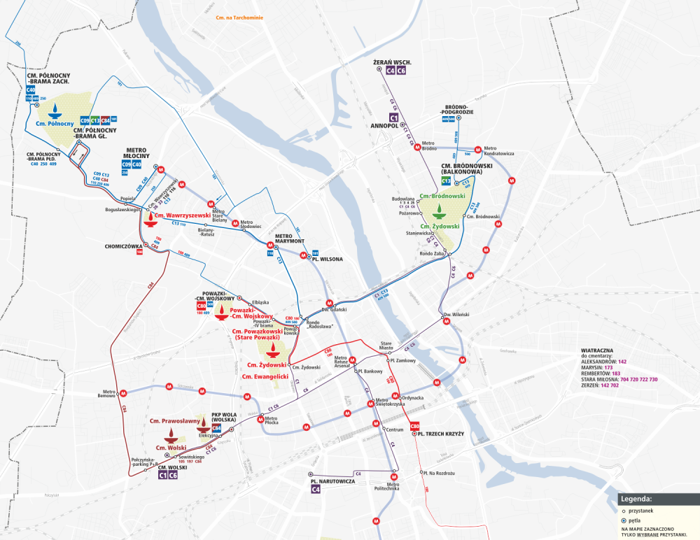 Na Cmentarz Wawrzyszewski: C13, C56, C70, C84, C88, 110, 116, 114, 203, 210, 250, 409, 26, 33, Z12, M1 + 26/33, Cmentarz Wolski: C1, C6, C12, C84, 105, 194, 197, 713, 716, 10, 11, 13, 26, 27, M2+10/11/13/26/27, Cmentarz Czerniakowski: 131, 164, 172, 180, 185, 189, 263, Cmentarz przy ul. Wałbrzyskiej: C89, 189, 193, M1 i Cmentarz Wilanowski: C89, 116, 131, 139, 163, 164, 180, 200, 251, 264, 519.