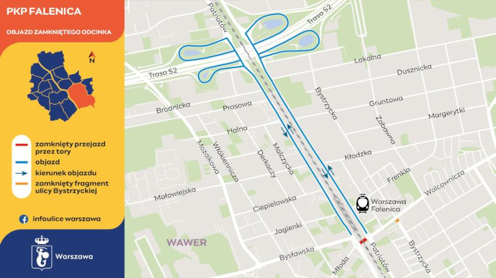– Autobusy, które przejeżdżały przez tory przejazdem kolejowym w Falenicy, teraz będą przecinały torowisko w węźle południowej obwodnicy Warszawy i ulicy Patriotów. Autobusy nie będą skręcały z Patriotów w ulicę Walcowniczą, tylko będą jechały dalej prosto do Ochoczej i nią dojadą do Narcyzowej, czyli do swojej stałej trasy – zapowiada rzecznik Zarządu Transportu Miejskiego Tomasz Kunert.