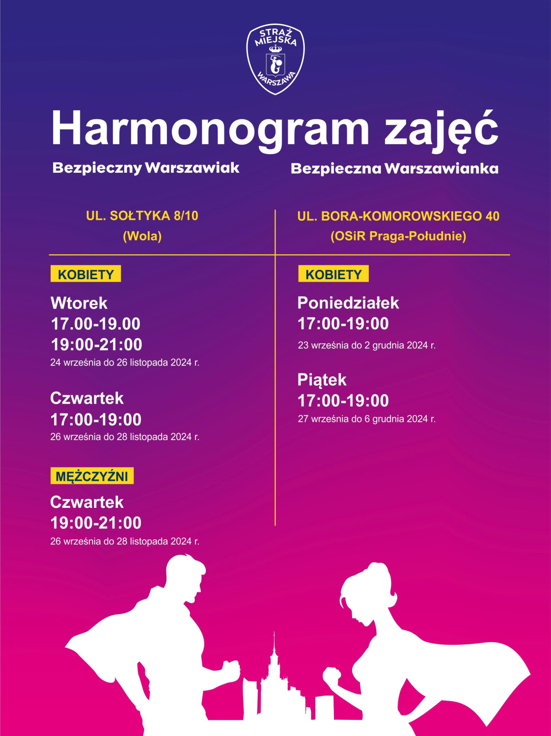 Ostatnia w tym roku edycja „Bezpiecznej Warszawianki” i „Bezpiecznego Warszawiaka” wystartuje pod koniec września. To cykl 10 cotygodniowych spotkań. W tej edycji, oprócz tradycyjnej, wolskiej lokalizacji przy ulicy Sołtyka 8/10, kurs po raz pierwszy zagości w hali Ośrodka Sportu i Rekreacji Pragi-Południe przy ulicy Bora-Komorowskiego 40. Dzięki temu w jesiennej edycji są miejsca dla ponad setki uczestników.