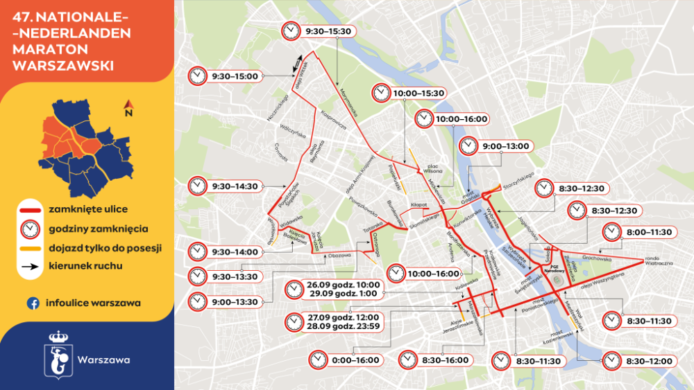 Kolejne ulice na trasie zawodów będą zamykane w niedzielę od około godziny 8.00 do 10.00. Kierowcy ponownie przejadą nimi możliwie szybko po przebiegnięciu ostatniego zawodnika i uprzątnięciu trasy. Część ulic w Śródmieściu i na Pradze-Południe zostanie otwarta jeszcze przed południem. Na ostatnie odcinki trasy ruch wróci około godziny 16.00. Jako ostatnia, w poniedziałek około godziny 1.00, zostanie otwarta ulica Świętokrzyska między Marszałkowską a Emilii Plater.
