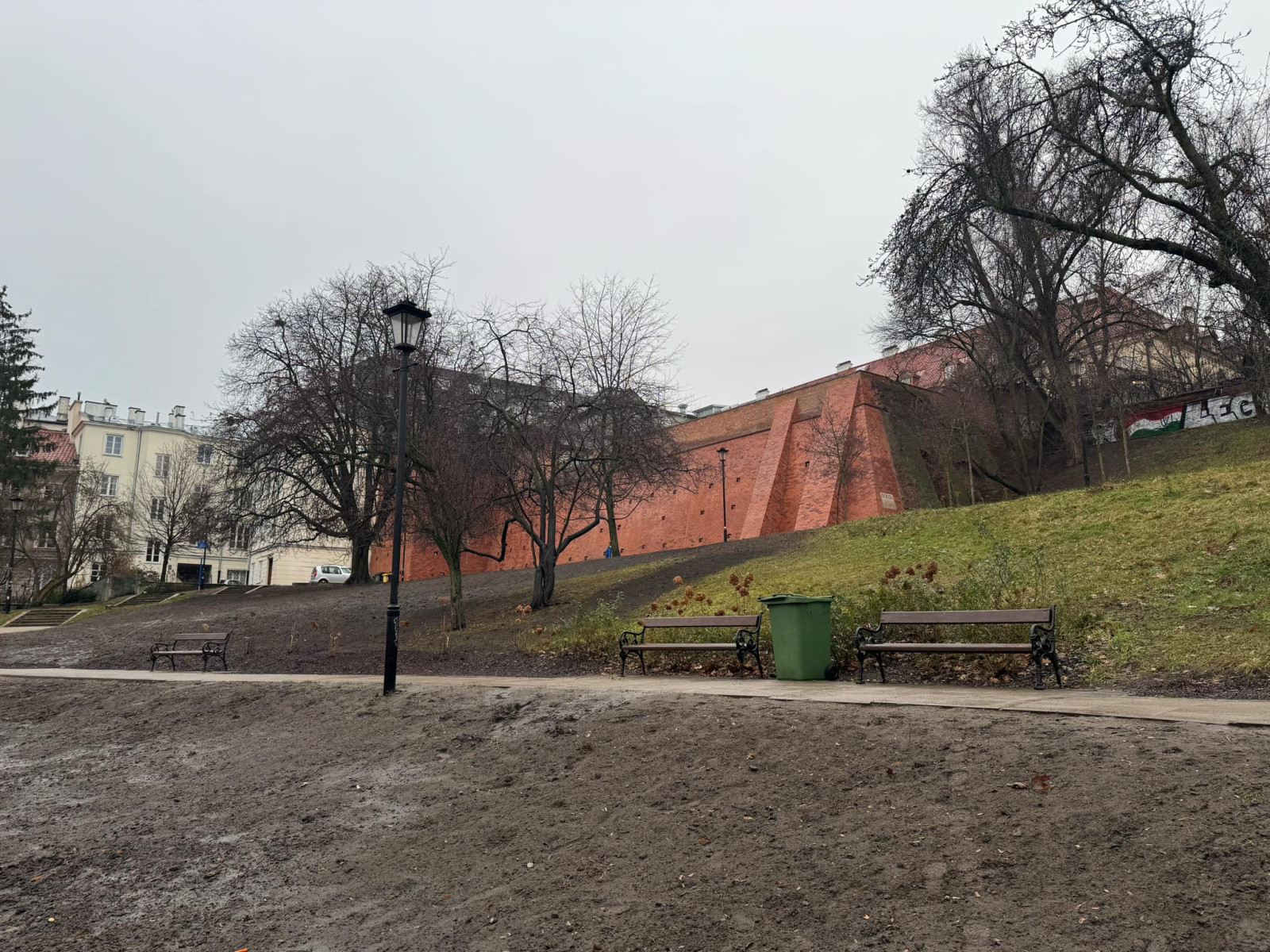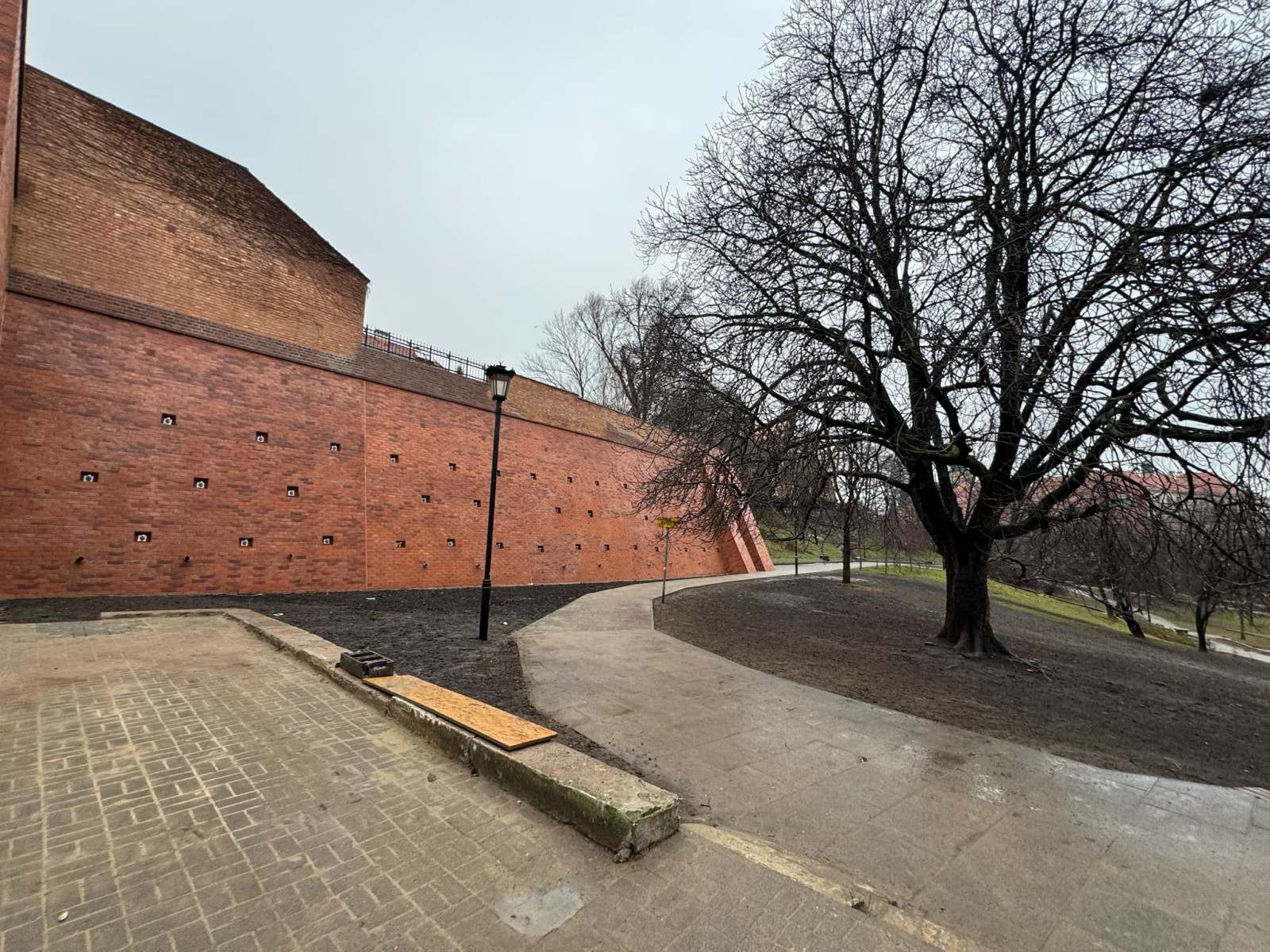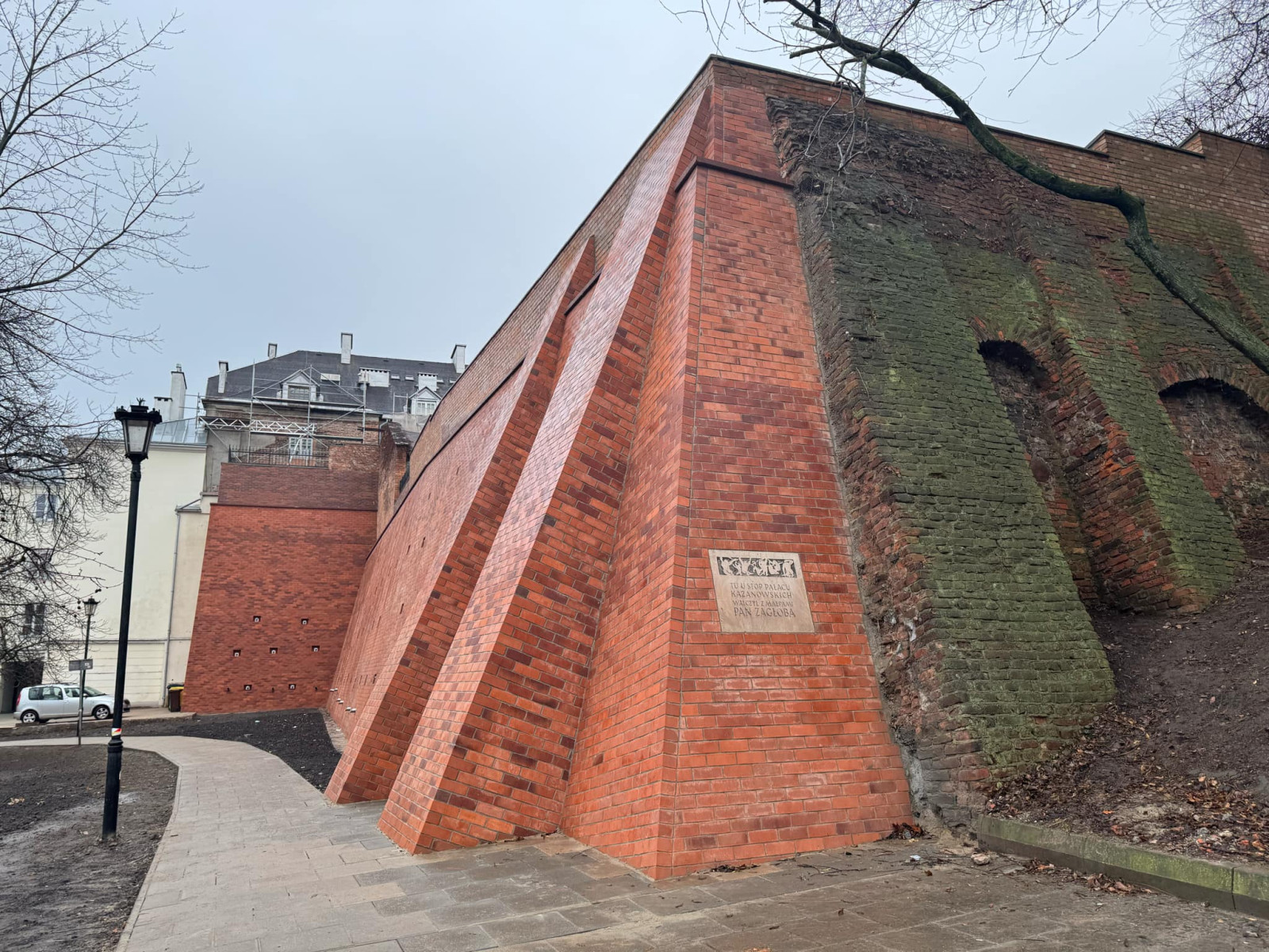 Na murach wisiała także tabliczka ostrzegawcza „Zakaz podchodzenia, spadające cegły”. Mury to pozostałość po siedemnastowiecznym Pałacu Kazanowskim.