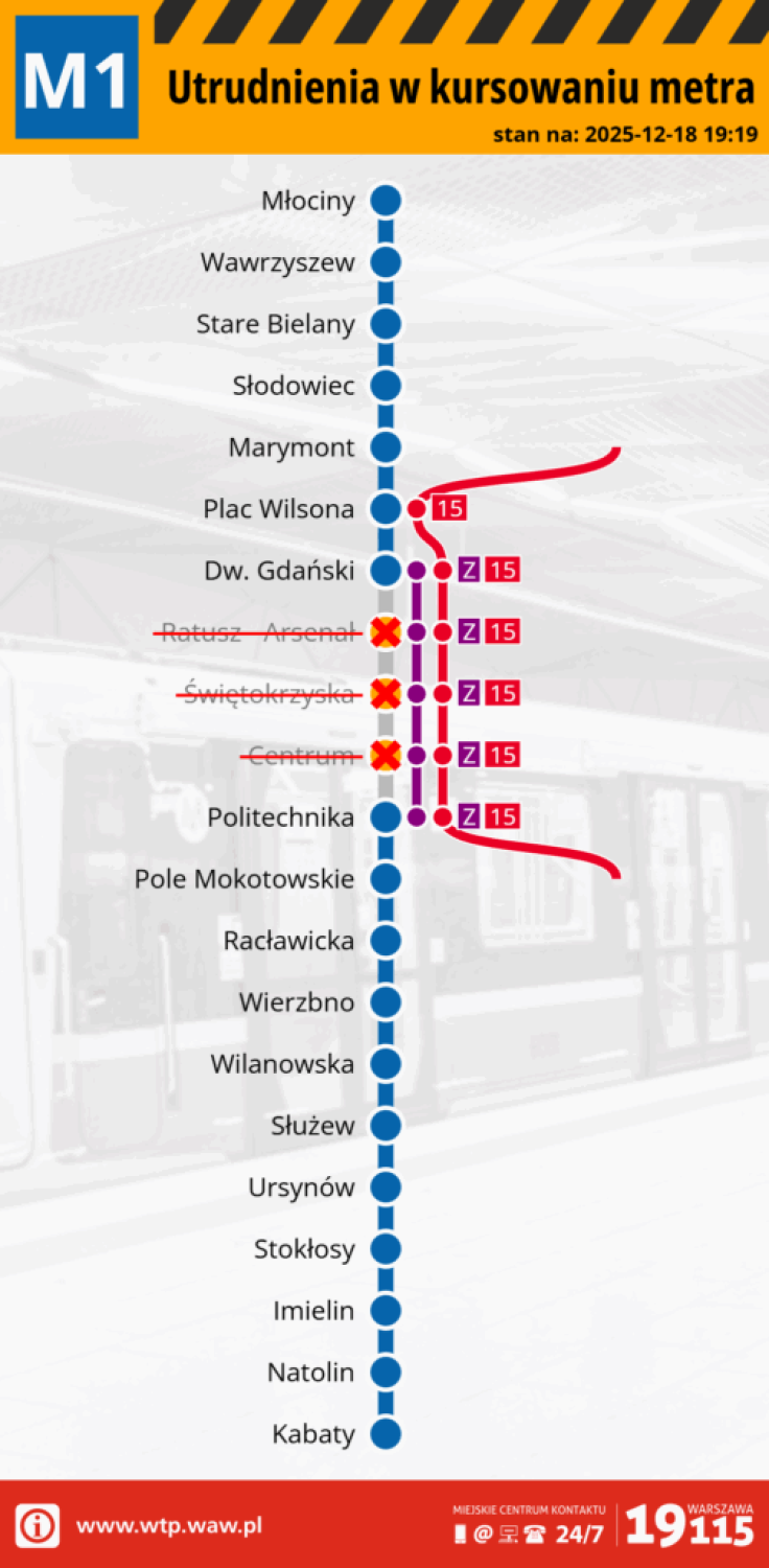 Wyłączone z ruchu są stacje Ratusz-Arsenał, Dworzec Gdański i Centrum.