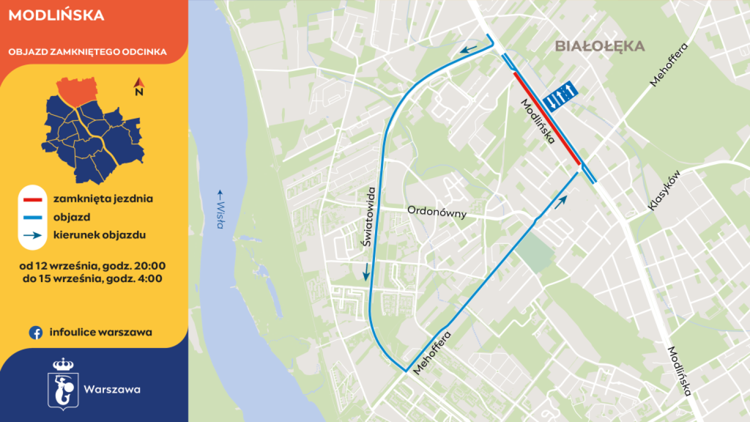 O godzinie 20:00 zamknięta zostanie nitka Modlińskiej od Ćwiklińskiej do Mehoffera. Za skrzyżowaniem z ulicy Winorośli w stronę Pragi-Północ kierowcy przejadą na drugą jezdnię. Będą tam mieli do dyspozycji jeden pas. Dwa pozostałe będą prowadziły w kierunku Legionowa. Lewy zostanie wygrodzony przed skrzyżowaniem z Mehoffera.