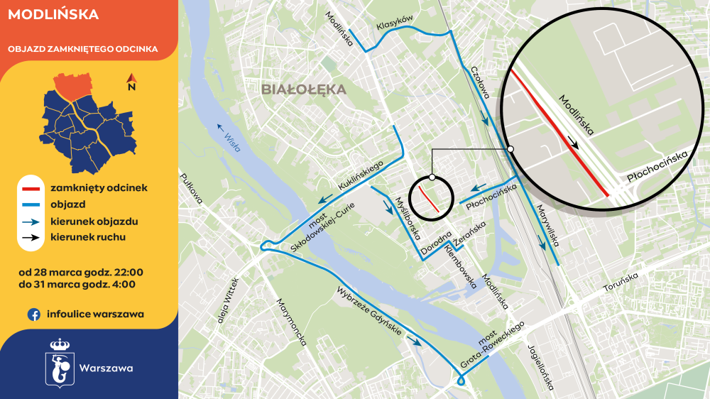Jadący od granicy miasta ominą utrudnienia ulicami: Klasyków, Czołową i Marywilską. Dojadą tędy do Płochocińskiej lub Trasy Toruńskiej. Utrudnienia będzie można ominąć także: aleją Kuklińskiego, mostem Skłodowskiej-Curie i Wybrzeżem Gdyńskim. Z kolei jadący Modlińską, będą mogli zawrócić w stronę Płochocińskiej na skrzyżowaniu z Żerańską i Kowalczyka.