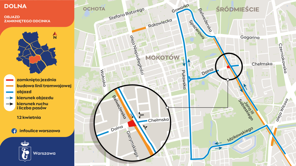 Ulica Dolna zostaje zamknięta za ulicą Gierymskiego do skrzyżowania z Belwederską, Sobieskiego i Chełmską.