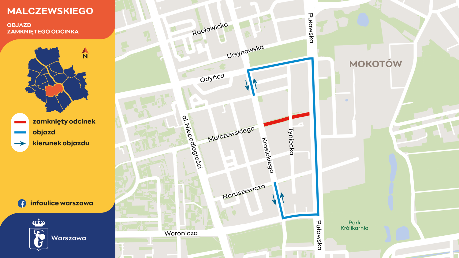 Drogowcy zamknęli ulicę Malczewskiego od strony ulicy Puławskiej, za wjazdem na parking i stację paliw, do ulicy Tynieckiej oraz od Tynieckiej do Krasickiego. Przejazd Tyniecką prosto jest cały czas możliwy. Utrudnienia można objechać ulicą Odyńca lub Woronicza.