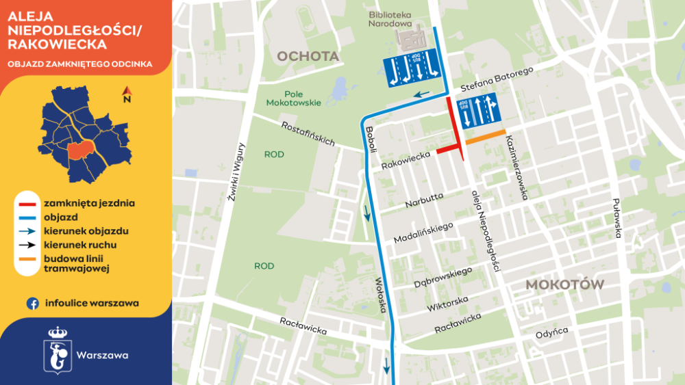 Wykonawca torowiska tramwajowego na Rakowieckiej rozpoczyna budowę rozjazdu na skrzyżowaniu z al. Niepodległości. Plac budowy zajmie jedną z jezdni przy stacji metra Pole Mokotowskie, a ul. Rakowiecka będzie zamknięta od Opoczyńskiej do al. Niepodległości.