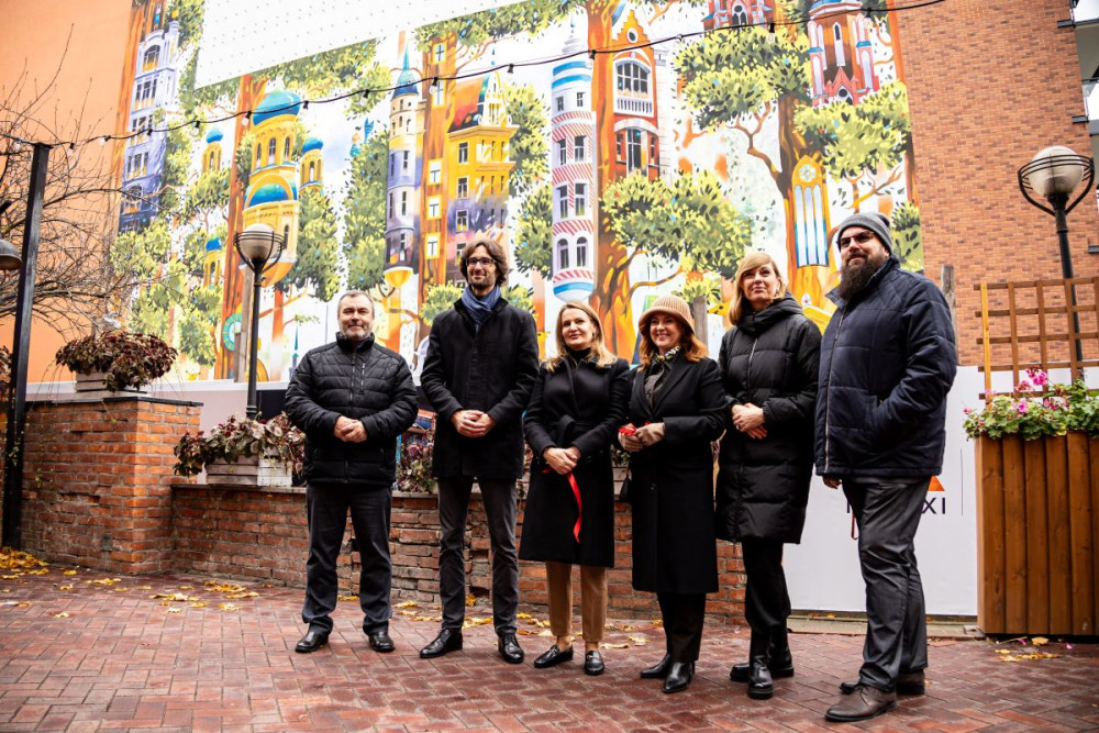 – Na tym muralu chciałem przedstawić miasto, które żyje w zgodzie z naturą. Miasto ciche, zielone, spokojne, w którym każdy może dla siebie znaleźć odrobinę oddechu. Chciałem przedstawić drzewa, żeby zwrócić uwagę na to, jaką wielką mają dla nas wartość. Pomagają nam w czasie upałów, powodzi, oczyszczają nasze powietrze, a tutaj, wśród drzew w koronach znalazły się ważne elementy praskiej architektury. Do każdego drzewa prowadzi portal zaczerpnięty z okolicznej zabudowy – kamienic i świątyń. Mural został tak pomyślany, żeby w przyszłości namalowana zieleń połączyła się z zielenią, która będzie porastać siatkę widoczną u góry. To też takie dzieło sztuki, które będzie się zmieniać w czasie – właśnie dzięki roślinności. Na niezwykłość lokalizacji tego muralu wpływa most pieszo-rowerowy, który jest wielką szansą na Pragi. Bardzo liczę, że mieszkańcy lewego brzegu i turyści dzięki niemu będą chcieli poznać i eksplorować Pragę. Marzę, by ten mural stał się jednym z elementów zachęcających do tego, żeby zejść z mostu, ruszyć w stronę Pragi i odkrywać, jaka jest piękna – mówił Tytus Brzozowski, artysta.