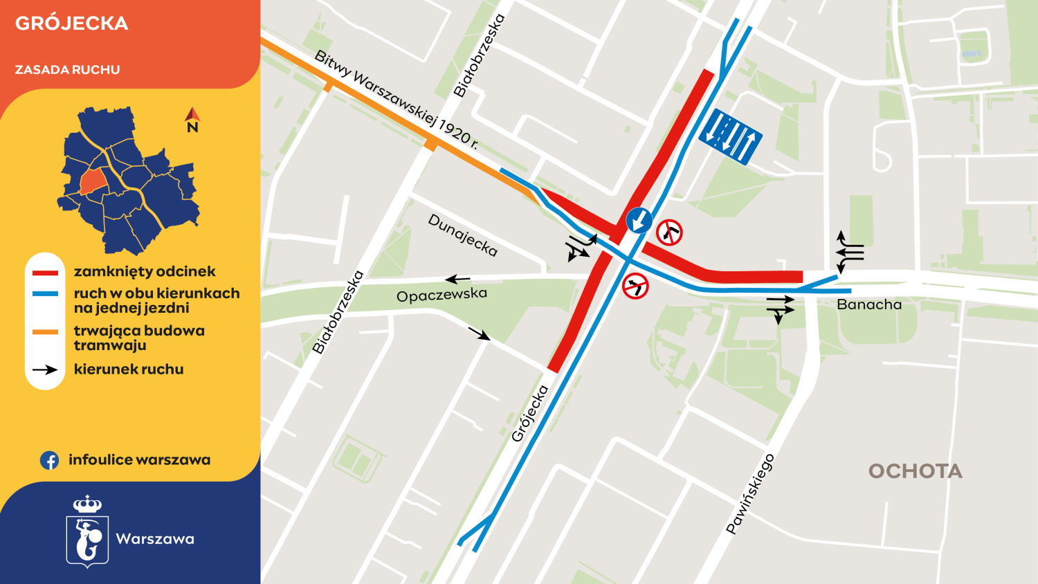 Organizacja ruchu na skrzyżowaniu ulic Grójeckiej, Bitwy Warszawskiej 1920 r. i Banacha będzie się wielokrotnie zmieniała w miarę postępu robót. Kolejne etapy będą wiązały się z zamykaniem wlotów Banacha czy Bitwy Warszawskiej 1920 r., a także czasowym wstrzymaniem ruchu tramwajów do pętli Banacha oraz P+R al. Krakowska. Roboty te planowane są między czerwcem a październikiem.