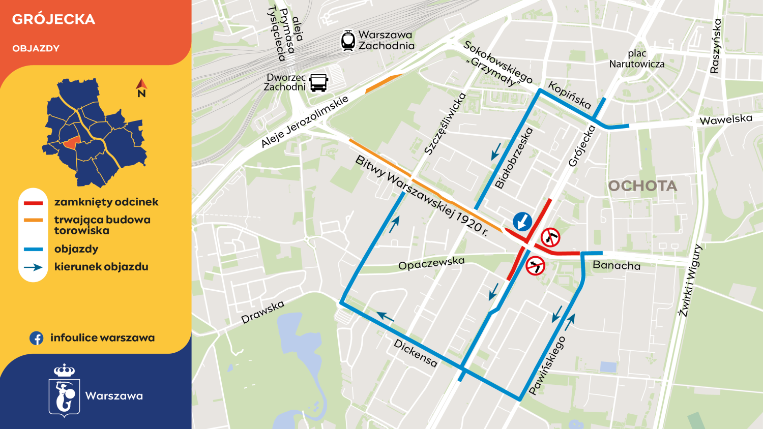 Ruch tramwajowy na ul. Banacha na warszawskiej Ochocie został czasowo wstrzymany. Tramwaje linii 1, 14 i 25 nie dojeżdżają do pętli Banacha. Zamknięta została również jezdnia ulicy Banacha służącą do tej pory do jazdy w kierunku Bitwy Warszawskiej 1920 r. – od Pawińskiego do Grójeckiej. W obu kierunkach kierowcy pojadą po południowej jezdni. Zmiany są związane z rozpoczęciem kolejnego etapu budowy tramwaju do Dworca Zachodniego.