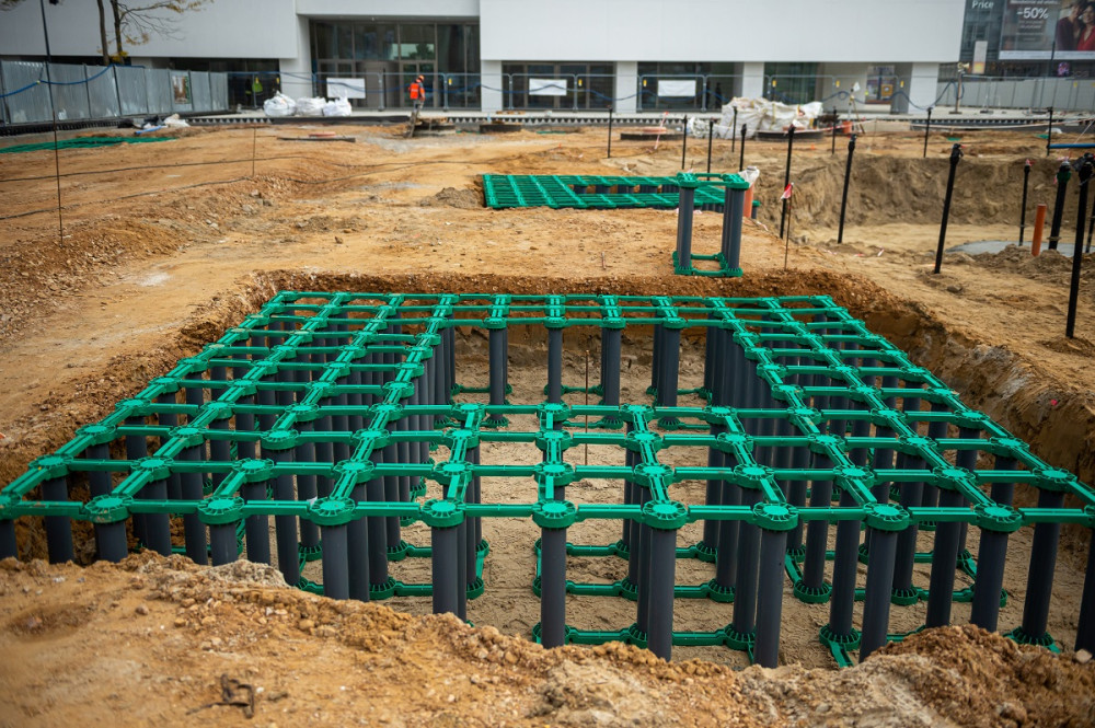 To jednak jeszcze nie wszystko – pod powierzchnią placu zamontowane zostały cztery – wykonane z prefabrykatu – zbiorniki retencyjne, których zadaniem jest gromadzenie wody opadowej.