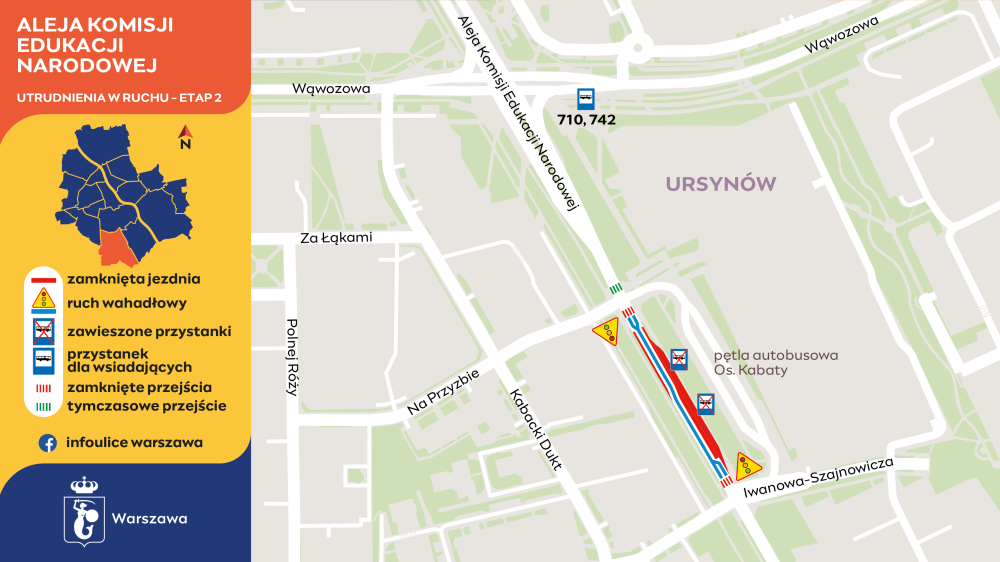 Dla pasażerów autobusów linii 710 i 742 ostatnim przystankiem na Ursynowie będzie Metro Kabaty 02 w Alei Komisji Edukacji Narodowej – za skrzyżowaniem z ulicą Wąwozową; Natomiast przystankiem dla wsiadających w kierunkach Targowisko (linia 710) i Rynek (linia 742) będzie Metro Kabaty 03 na ulicy Wąwozowej.