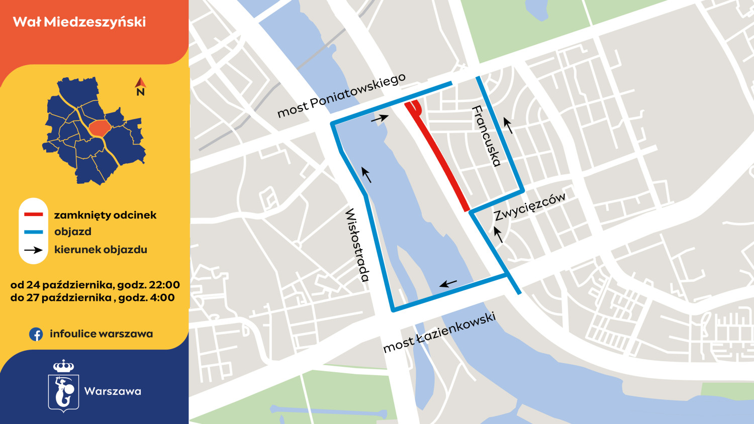 Utrudnienia można ominąć mostem Łazienkowskim, Wisłostradą i mostem Poniatowskiego. Objazd prowadzi także ulicami Zwycięzców i Francuską do alei Waszyngtona lub ulicami Targową i aleją Zieleniecką. Tymi ulicami jeżdżą też autobusy linii 146 i 147 w kierunku Falenicy i Pogodnej.