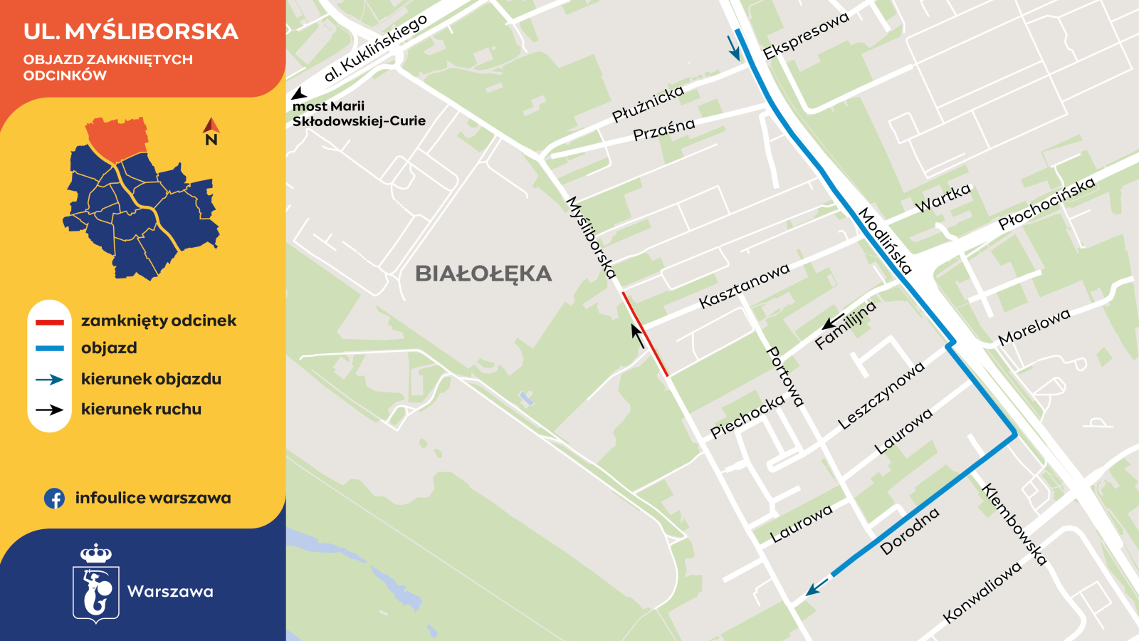 Jezdnia w miejscu prowadzonych robót została zwężona do trzech metrów. Na odcinku pomiędzy drogami wewnętrznymi prowadzącymi do posesji Myśliborska 42 i 64 obowiązuje ruch jednokierunkowy. Tak jak w przypadku wcześniejszych etapów, kierowcy pojadą tędy wyłącznie w stronę ulicy Świderskiej. Objazd w przeciwnym kierunku prowadzi ulicami Światowida, Modlińską i Dorodną.