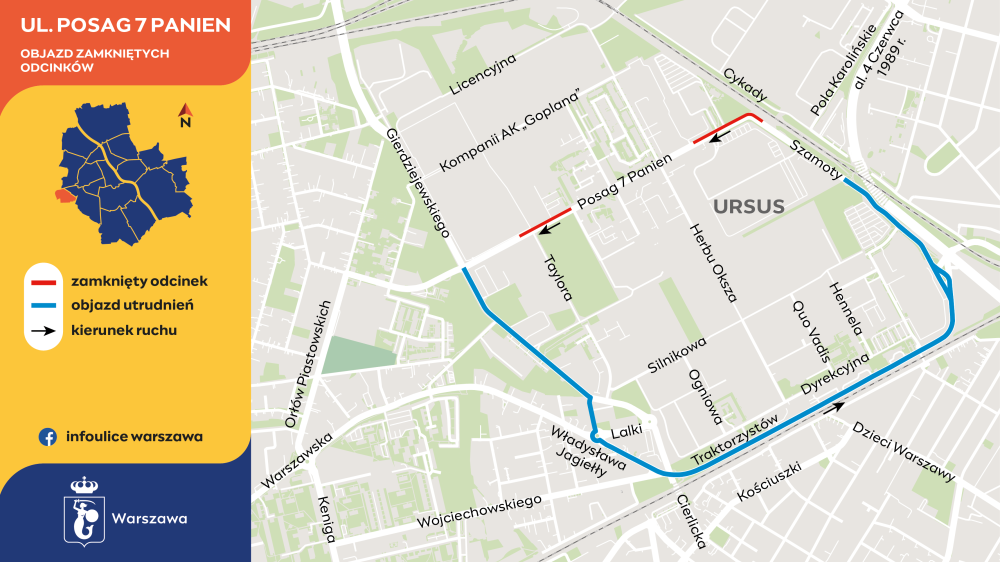 Z kolei w Ursusie na ulicy Posag 7 Panien drogowcy zaczynają układać nową nawierzchnię. Na ulicy został wprowadzony ruch jednokierunkowy. Autobusy jadą zmienionymi trasami.