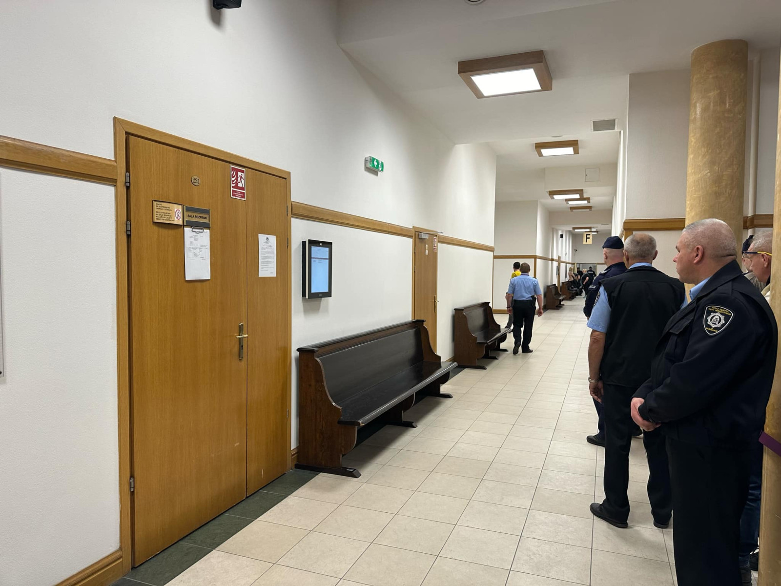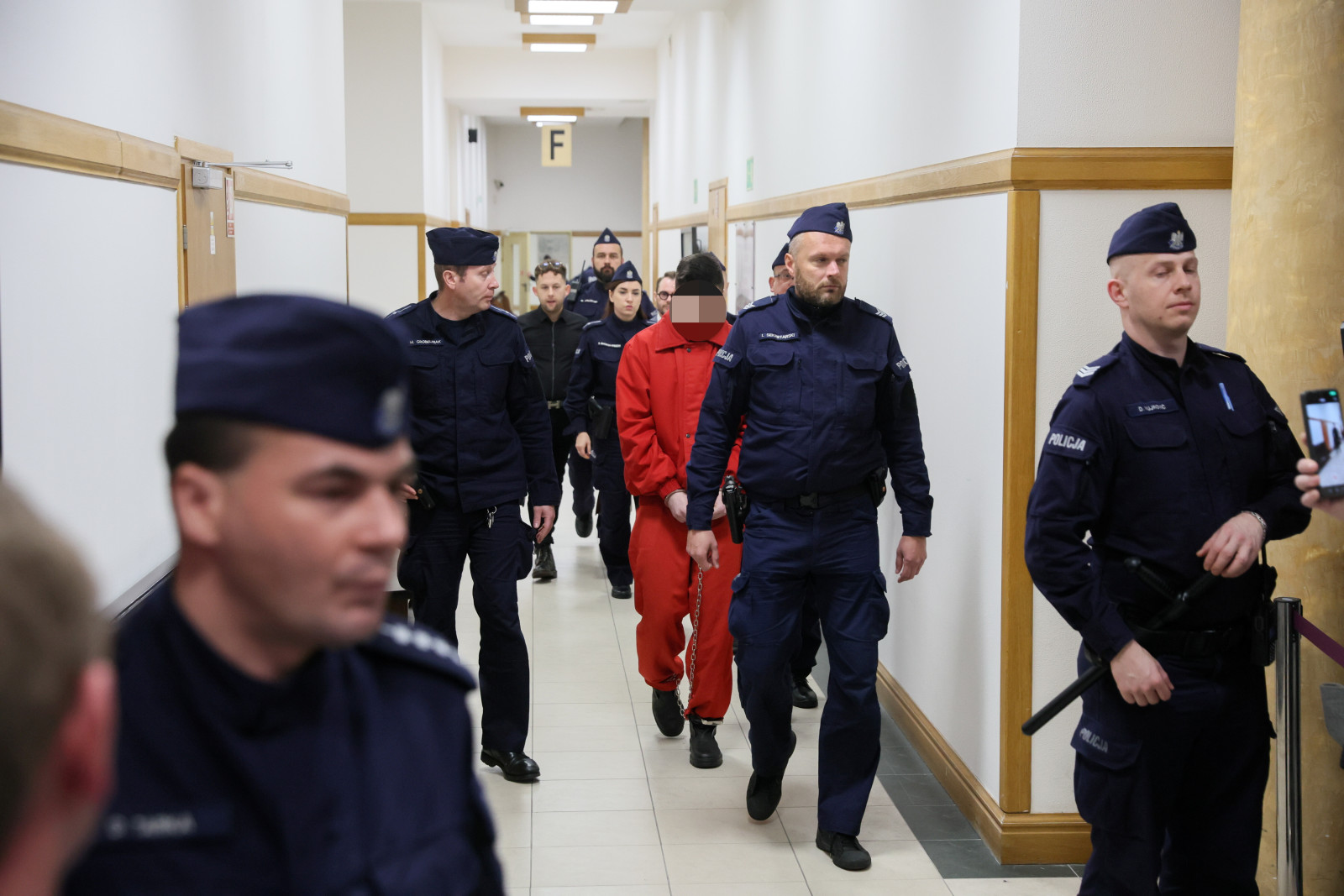 Mężczyzna po godz. 10:00 został wprowadzony głównymi drzwiami na salę rozpraw. Ubrany w czerwony kombinezon był prowadzony przez kilku funkcjonariuszy policji.
