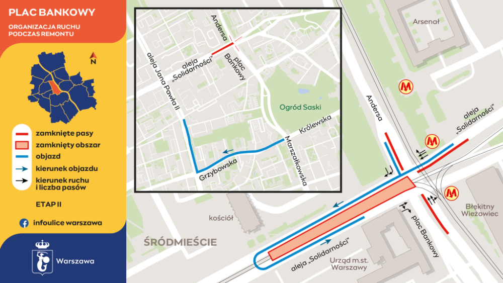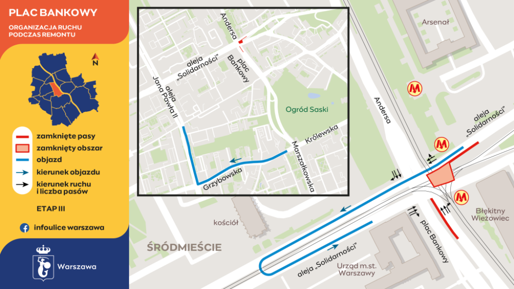Na samym placu Bankowym zostaną wygrodzone pasy służące do skrętu w lewo, w aleję „Solidarności”. Objazd zostanie poprowadzony ulicą Grzybowską i aleją Jana Pawła II.