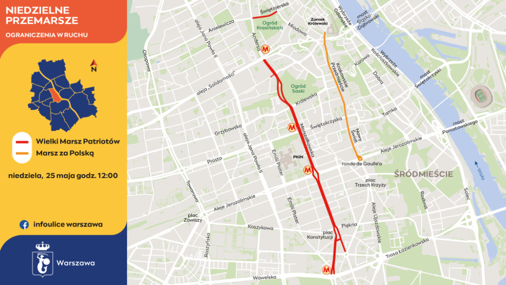 Tablice informacyjne będą sugerowały kierowcom, żeby omijali plac Bankowy. Zalecane objazdy poprowadzą aleją Jana Pawła II do Świętokrzyskiej, ulicami Stawki lub Anielewicza do alei Jana Pawła II lub Wisłostradą do mostu Poniatowskiego i Alej Jerozolimskich.