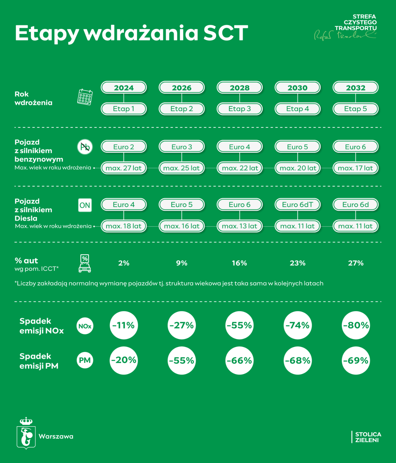 Aby wjechać do warszawskiej SCT na pierwszym etapie, kierowca będzie musiał prowadzić samochód benzynowy spełniający co najmniej normę Euro 2 (z rocznika 1997 lub nowszy) lub samochód z silnikiem Diesla spełniający co najmniej normę Euro 4 (z rocznika 2006 lub nowszy), jak również będzie musiał mieć wydaną przez miasto nalepkę na szybie, informującą o roczniku produkcji i paliwie, jakim zasilany jest silnik.