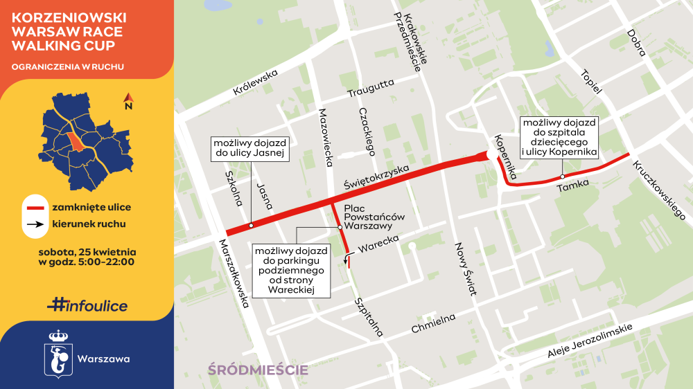 Przygotowania do zawodów rozpoczną się w sobotę, 25 kwietnia, o godzinie 5:00. Ulica Świętokrzyska zostanie zamknięta pomiędzy Marszałkowską a Kopernika. Skrzyżowanie z Nowym Światem pozostanie otwarte – autobusy będą bez zmian kurowały Traktem Królewskim.
