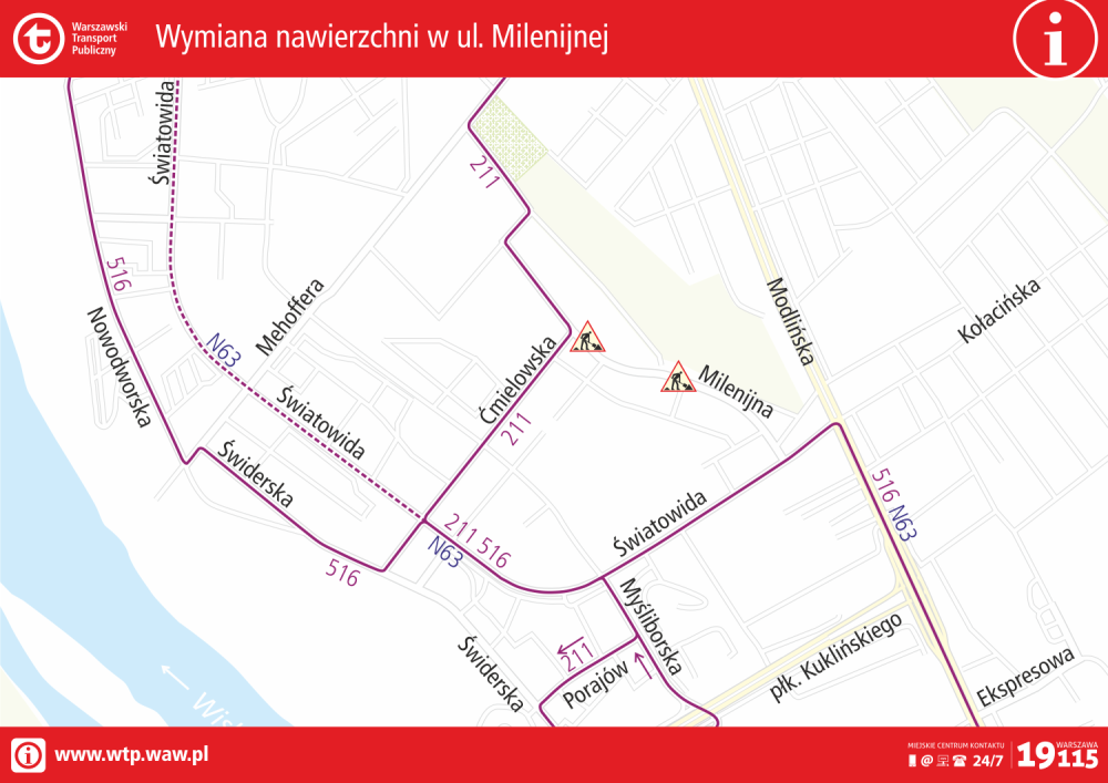 Od środy, 21 sierpnia, do piątku, 23 sierpnia, linia 211 pojedzie ulicami Światowida i Ćmielowską. Autobusy 516 i N63 będą kursowały ulicą Światowida.