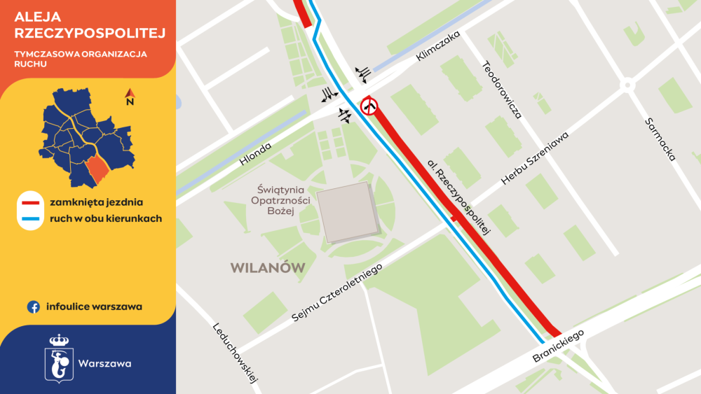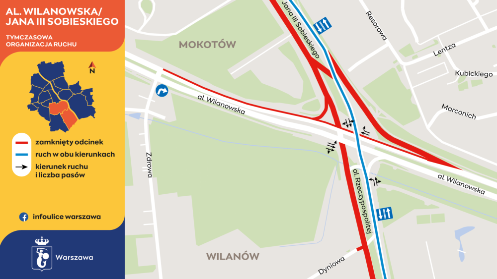 Na poniedziałek, 28 października, wykonawca zaplanował zmiany w organizacji ruchu. Kierowcy ponownie pojadą dwiema jezdniami alei Wilanowskiej przez skrzyżowanie z ulicą Jana III Sobieskiego i aleją Wilanowską. Na nitce od strony Powsińskiej będzie osobny pas do skrętu w ulicę Jana III Sobieskiego i drugi do jazdy prosto w stronę Doliny Służewieckiej.