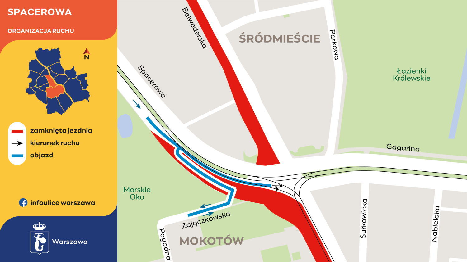 W ramach zmian kierowcy zjeżdżający w dół ulicą Spacerową – za zebrą przy parku Morskie Oko – jadą tzw. trambuspasem. Na skrzyżowaniu z Belwederską, jest jeden pas prosto i w prawo. Cały czas otwarte pozostaje połączenie Zajączkowskiej ze Spacerową.