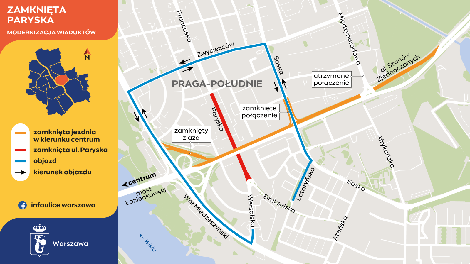 Zamkniętą ulicę Paryską będzie można ominąć, jadąc ulicą Wersalską, Wałem Miedzeszyńskim i ulicą Zwycięzców lub ulicą Zwycięzców do Saskiej i Lotaryńskiej.