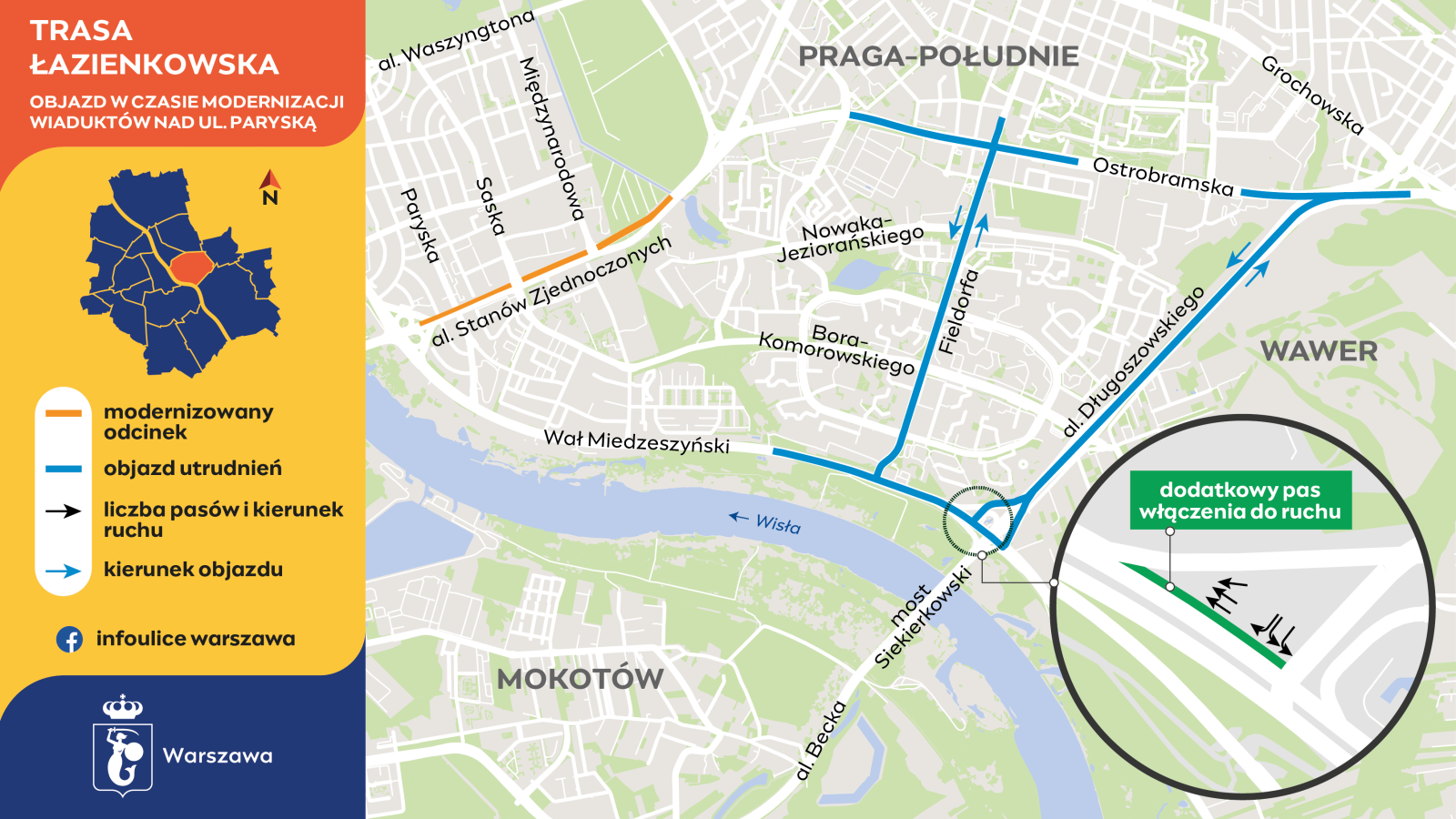 Utrudnienia w okolicach ulic Bajońskiej i Paryskiej na stołecznej Pradze Południe. Rozpoczął się kolejny etap modernizacji wiaduktów Trasy Łazienkowskiej. Jedną z dróg objazdowych będzie Trasa Siekierkowska. Roboty mają się zakończyć w pierwszej połowie maja.