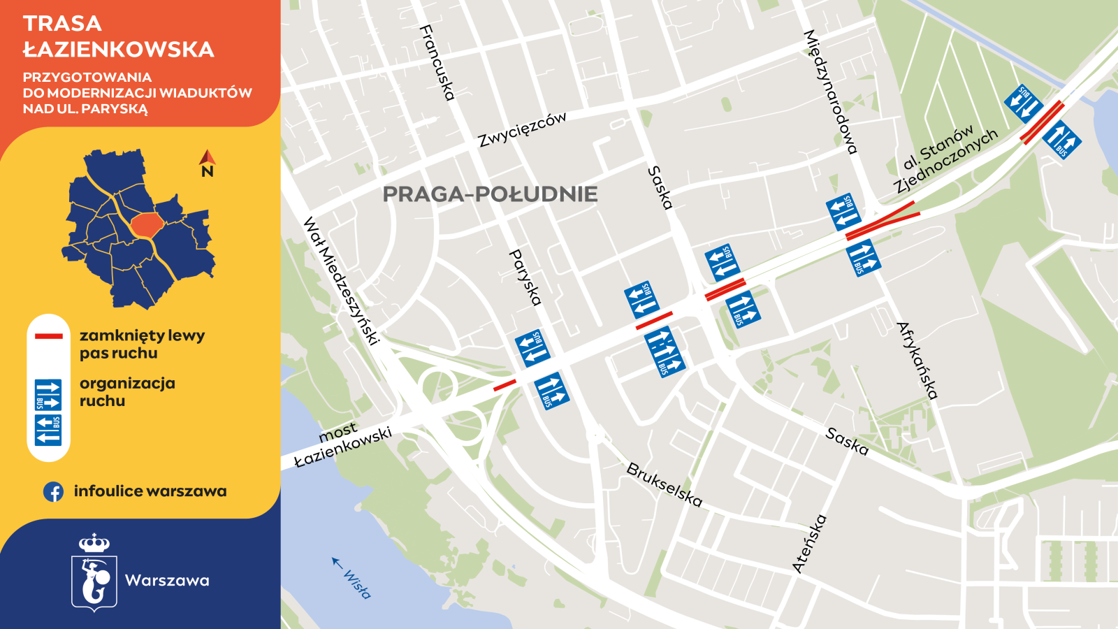– Rozpoczynające się prace wymagają zamykania fragmentów lewych pasów ruchu na obydwu jezdniach alei Stanów Zjednoczonych od rejonu Kanału Wystawowego do wiaduktów nad Wałem Miedzeszyńskim. Wyłączenia rozpoczną się w środę 12 kwietnia i będą wprowadzane sukcesywnie – dodaje Choińska-Ostrowska.