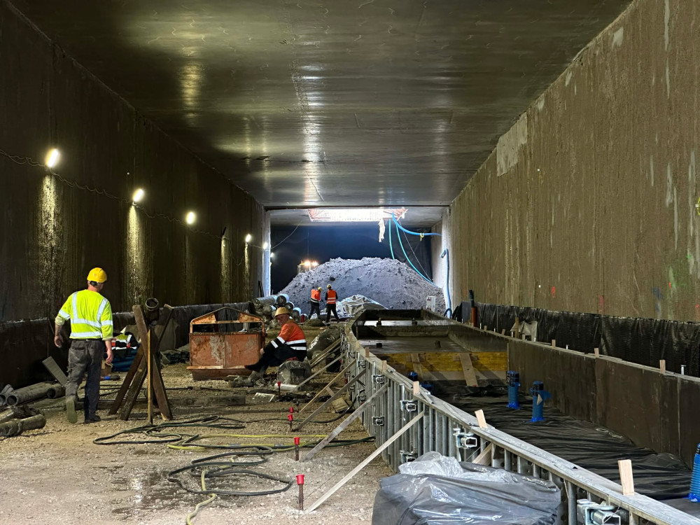 W marcu wykonawca rozpoczął wylewanie odcinków płyty torowej na rampie zjazdowej i w tunelu pod Parkiem Pięciu Sióstr. Pierwsze płyty są już gotowe – z miejscem pod elementy torowiska, w tym szyny, mocowania czy wibroizolację. Same szyny zostały już zwiezione na plac budowy i czekają na montaż.