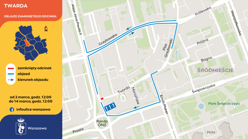 Ulica Twarda od strony Grzybowskiej będzie kończyła się ślepo przed placem budowy. Zamknięty odcinek Twardej można ominąć ulicami Emilii Plater i Świętokrzyską lub Grzybowską.
