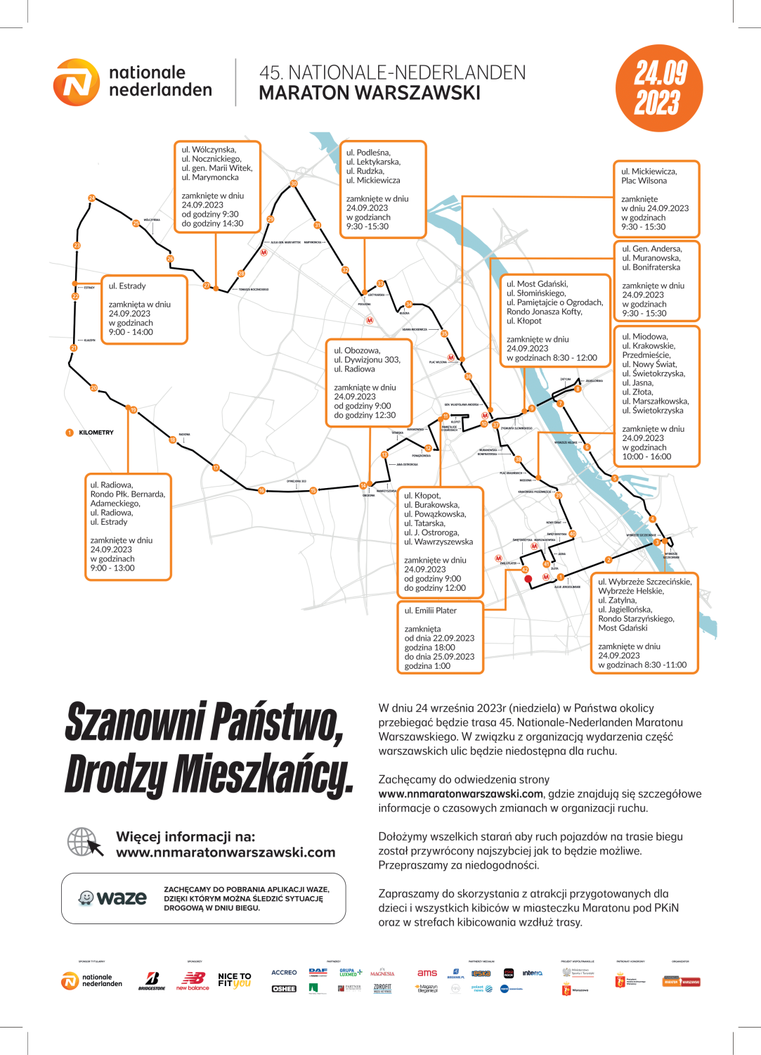W niedzielę odbył się 45. Maraton Warszawski. Na kierowców i pasażerów komunikacji miejskiej czekały gigantyczne utrudnienia. Ulice wyłączane były z ruchu od godziny 8:30. Z kolei pierwsze drogi zaczęły być udrażniane po godzinie 11, a ostatnie do godziny 16. Tylko ulica Emilii Plater zostanie otwarta dopiero w poniedziałek, 25 września o godzinie 1 w nocy.