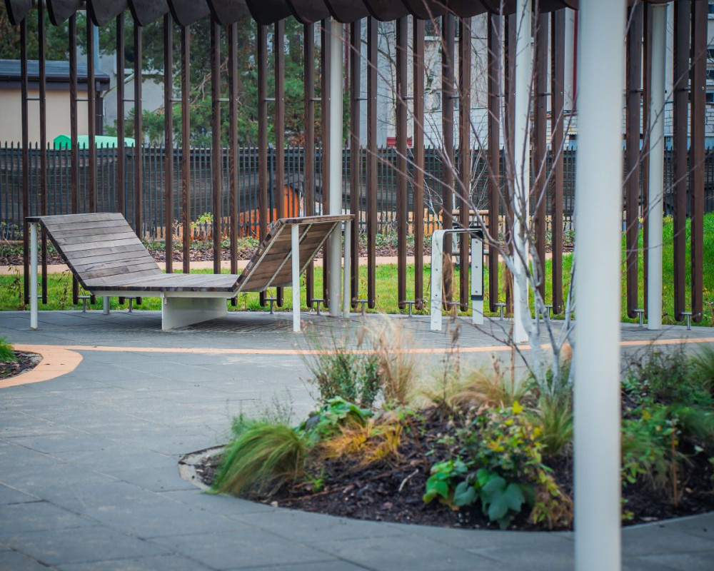 Powstała również wiata wielofunkcyjna wyposażona w elementy małej architektury – ławki, stoliki, ławy i stojaki.