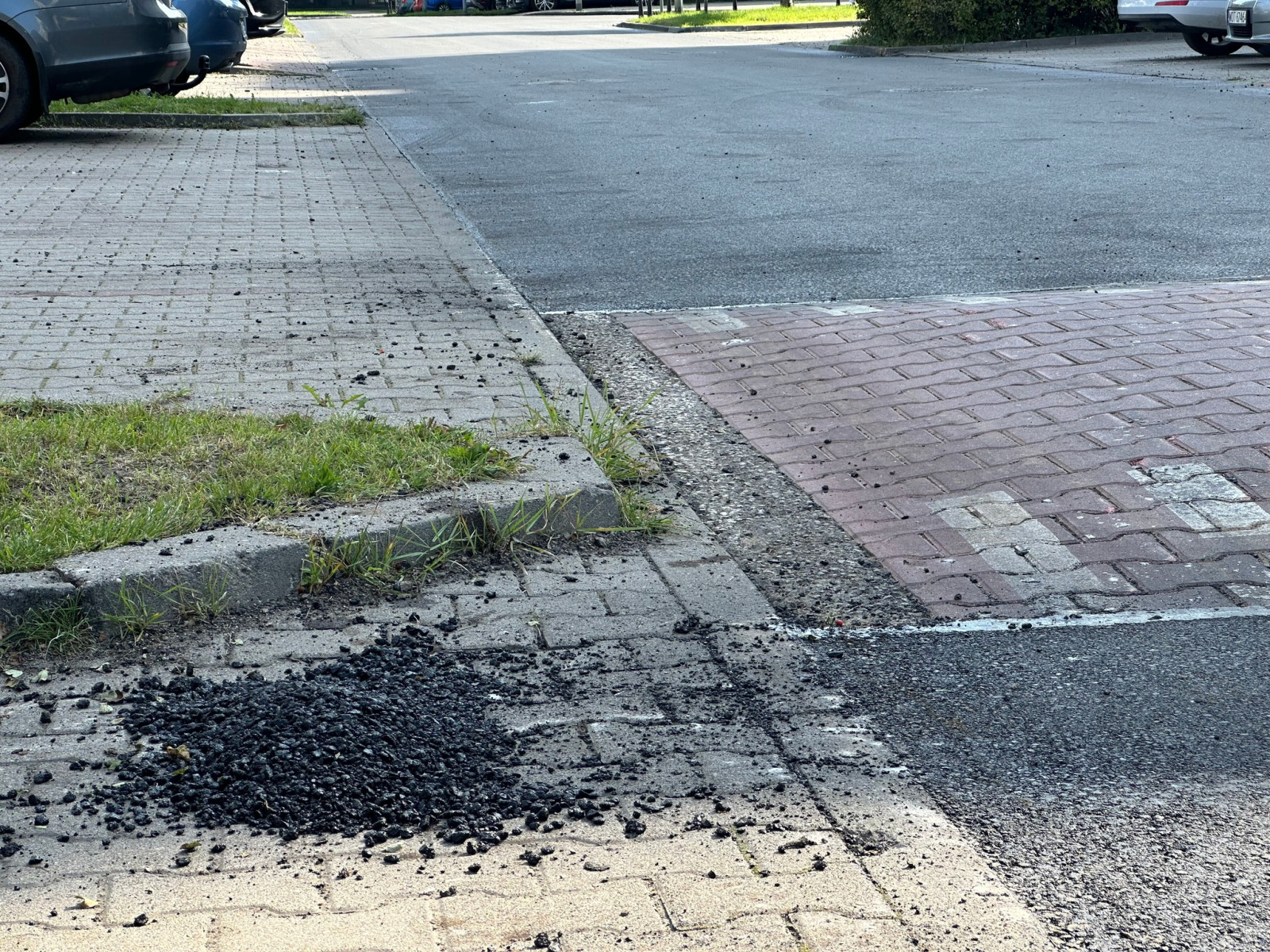 Kawałki asfaltu porozwalane na chodnikach i miejscach parkingowych – to pozostałości po remoncie ulicy Telekiego na Ursynowie.