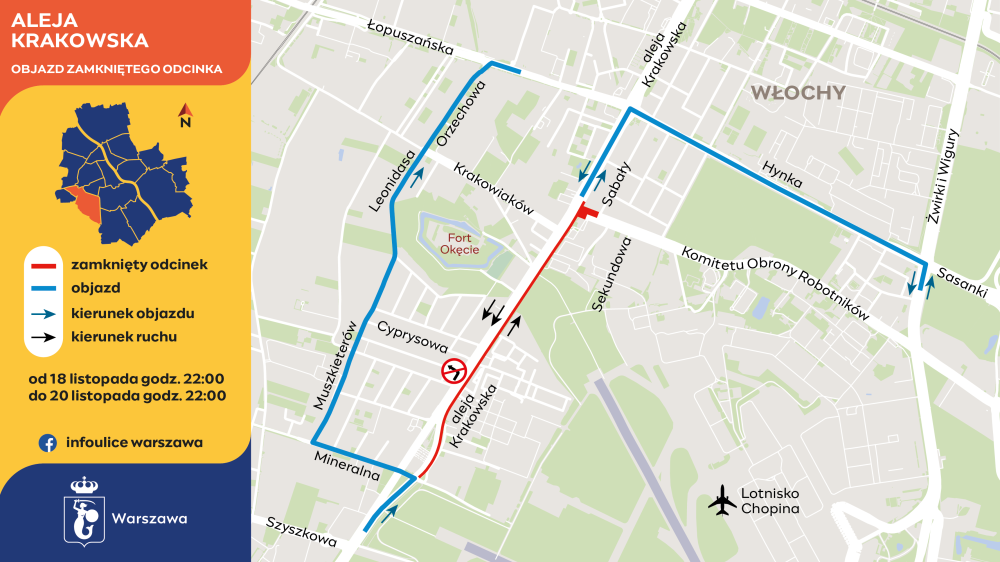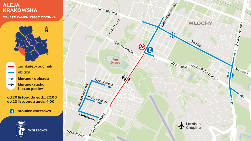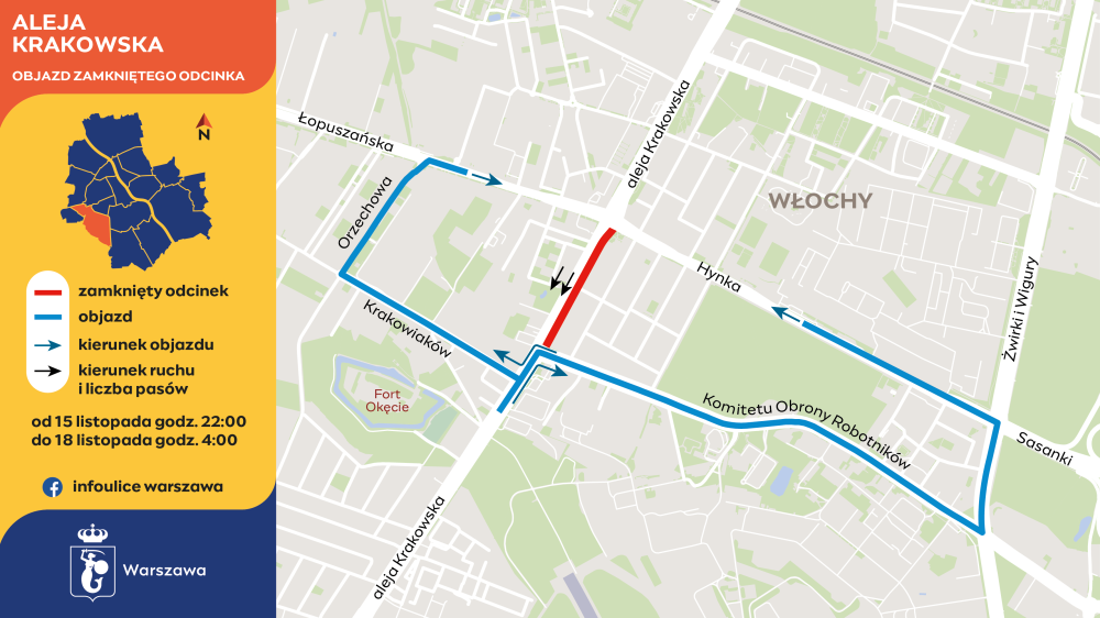 Od poniedziałku, 18 listopada, od godziny 22:00 do środy, 20 listopada, do godziny 22:00 robotnicy zajmą prawy i środkowy pas jezdni alei Krakowskiej w kierunku Ochoty, od ulicy Malowniczej do KOR. Lewy pas pozostanie przejezdny.