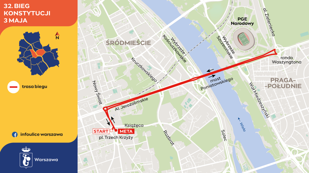 W tym roku zmieniło się miejsce startu i mety Biegu Konstytucji 3 Maja. Uczestnicy rozpoczynają i kończą zmagania na placu Trzech Krzyży. Będzie też ich można zobaczyć na rondzie de Gaulle’a, moście Poniatowskiego i rondzie Waszyngtona. Start biegu o godzinie 11, a na pokonanie pięciokilometrowej trasy biegacze będą mieli 55 minut.
