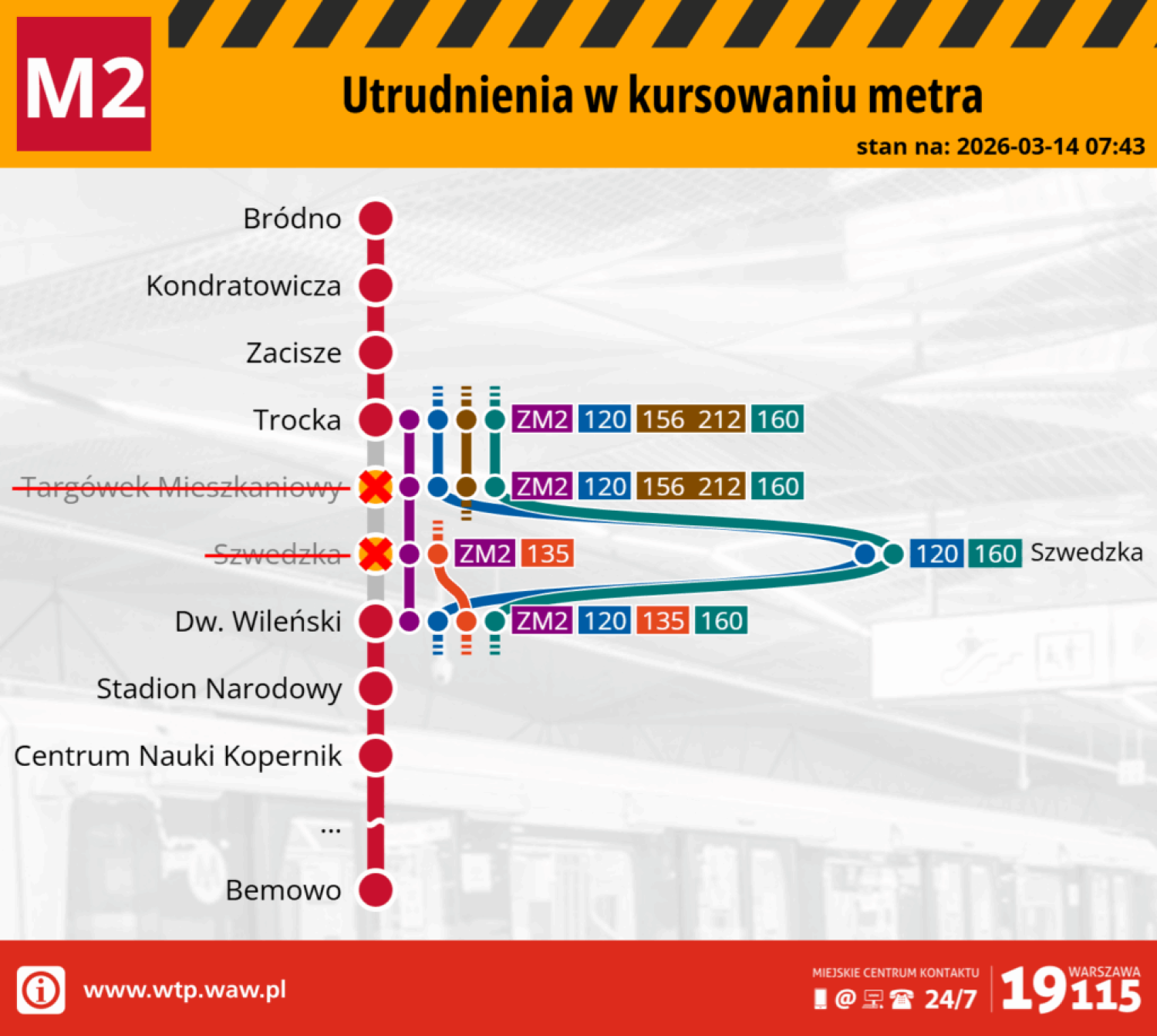 Ze względu na utrudnienia pociągów metra linii M2 składy kursują w dwóch pętlach: Bródno – Trocka oraz Dworzec Wileński – Bemowo – poinformował w sobotę Zarząd Transportu Miejskiego. Uruchomiono komunikację zastępczą.
