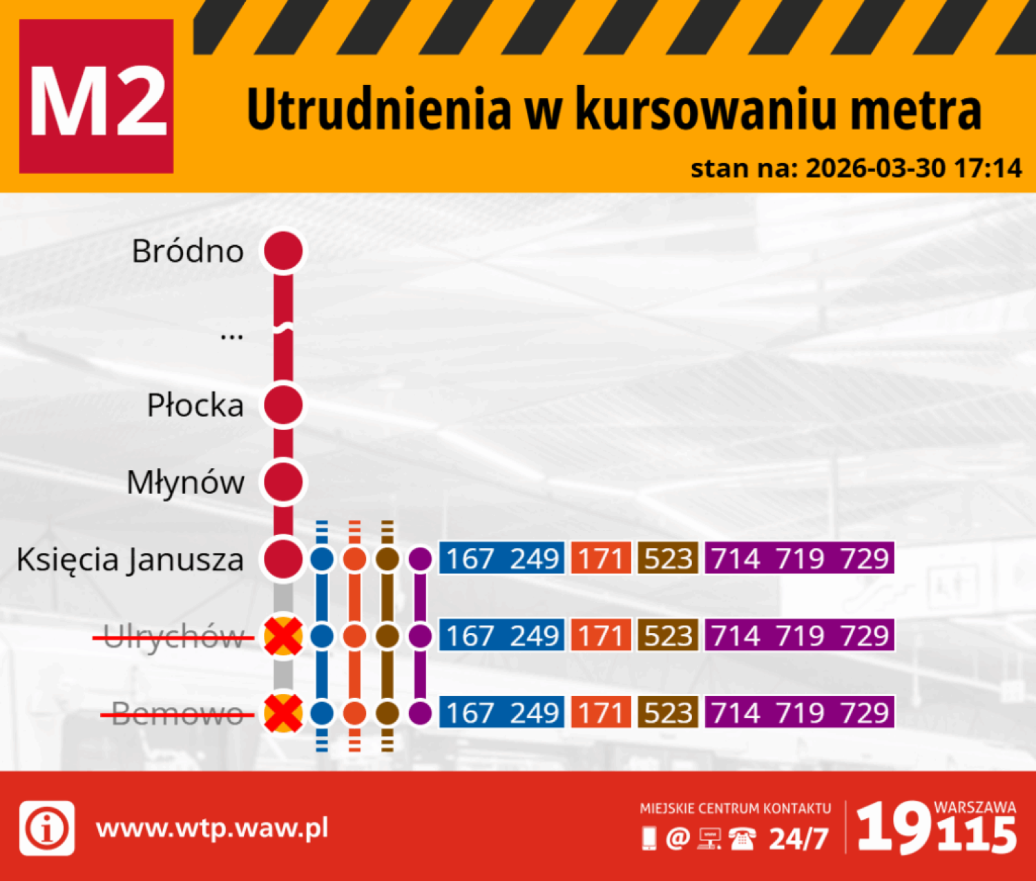 Utrudnienia w kursowaniu linii metra M2 – pociągi kursują w pętli Bródno – Księcia Janusza. Warszawski Transport Publiczny sugeruje pasażerom korzystanie z autobusów miejskich.