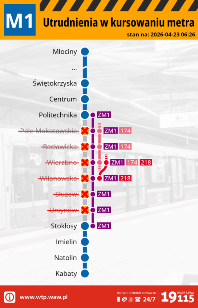 Utrudnienia w M1. Stacje metra Ursynów, Służew, Wilanowska, Wierzbno, Racławicka i Pole Mokotowskie były wyłączone z użytkowania.