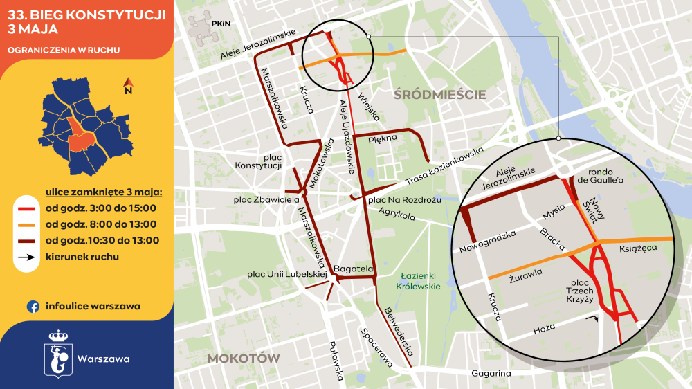 Około godziny 8:00 zamknięty zostanie cały Plac Trzech Krzyży, a na trasę objazdową przez Aleje Jerozolimskie, Wioślarską i Ludną zostaną skierowane autobusy linii 127 i 131.