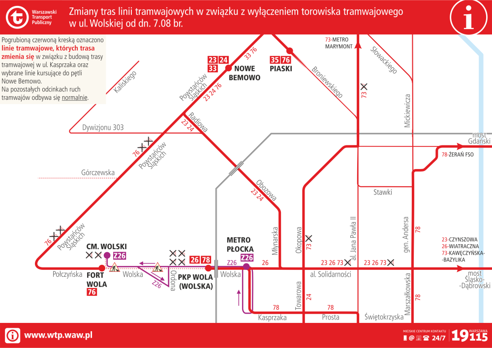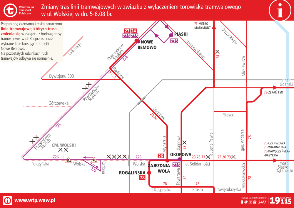W weekend 5-6 sierpnia linia 23 powróci na trasę podstawową łącząc Nowe Bemowo z Czynszową; linia 26 skierowana zostanie na trasę skróconą: z pętli Wiatraczna, (…), Wolska do Zajezdnia Wola, a dalej jako linia 78 w kierunku Żerania FSO; linia 78 pojedzie po trasie z Żerania FSO, (…) do ulicy Kasprzaka, Skierniewickiej i Rogalińskiej, a dalej jako linia 26 w kierunku Wiatracznej; lina 73, tramwajowa linia uzupełniająca będzie kursować z Metra Marymont ulicami Słowackiego, Popiełuszki, aleją Jana Pawła II, Okopową, aleją "Solidarności", mostem Śląsko-Dąbrowskim, aleją "Solidarności", Targową, Kijowską, aleją Tysiąclecia, Kawęczyńską do pętli Kawęczyńska-Bazylika.