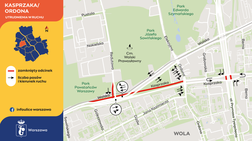 Zwężenie wlotu ulicy Redutowej wymusi wprowadzenie zakazu skrętu w lewo w tę ulicę – dla jadących Wolską od strony Bemowa. Chcący pojechać tym kierunku będą mogli zawrócić na skrzyżowaniu Wolskiej z Elekcyjną lub pojechać prosto Kasprzaka i skręcić w lewo w Ordona żeby wrócić do Wolskiej. Cały czas Skręcić w Redutową będą mogli nadjeżdżający od Elekcyjnej.