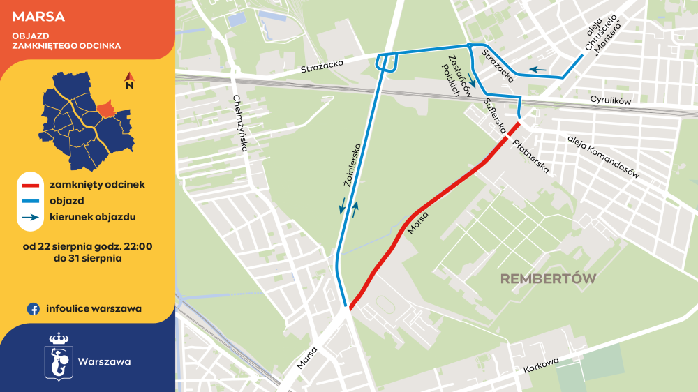 Roboty remontowe na ulicy Marsa na Rembertowie rozpoczęły się w piątek o godzinie 22.00. Ulica Marsa została zamknięta od Żołnierskiej do Ilskiego.