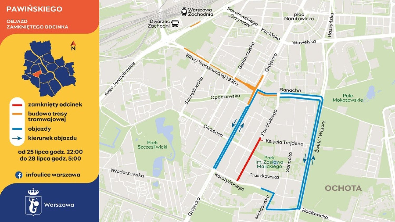Drogowcy podzielili prace na dwa etapy – od dziś, od godziny 22.00, do godziny 5.00 w poniedziałek zamknięty będzie odcinek ulicy od Księcia Trojdena do Korotyńskiego. Nie będzie wyjazdu na Pawińskiego z Księcia Trojdena, Dickensa i Pruszkowskiej. Zaplanowane zostały objazdy – oprowadzą ulicami Banacha, Żwirki i Wigury, Racławicką, Mołdawską i Korotyńskiego lub Banacha oraz Grójecką.