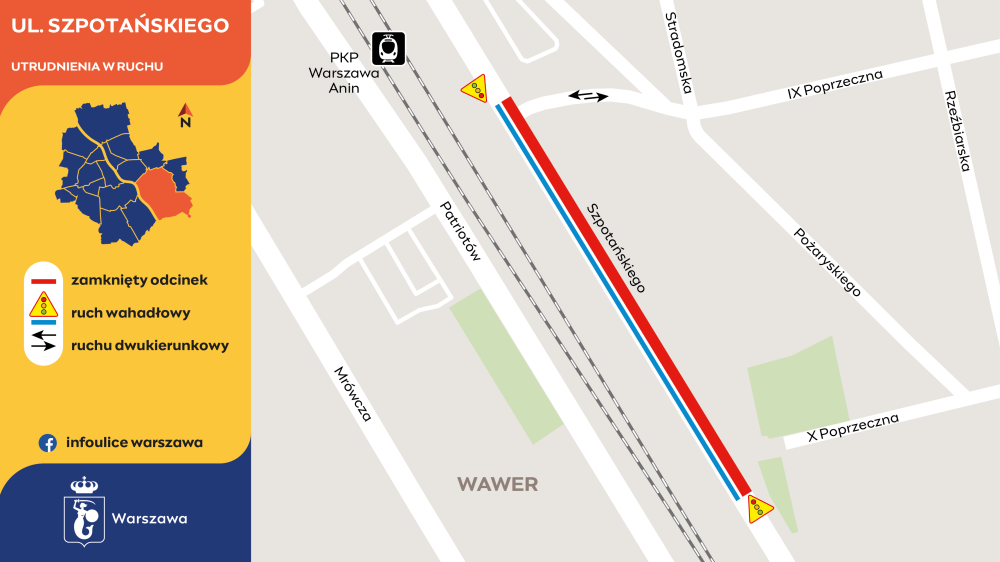 W związku z pracami kanalizacyjnymi w czwartek zostaną wprowadzone czasowe zmiany w ruchu w Wawrze i na Białołęce. Kolejarze zwężą jezdnię Szpotańskiego do jednego pasa, między IX a X Poprzeczną. Zostanie ustawiona sygnalizacja świetlna, a kierowcy pojadą wahadłowo. Ul. Kobiałka również będzie zwężana do jednego pasa na krótkich, około stumetrowych fragmentach.