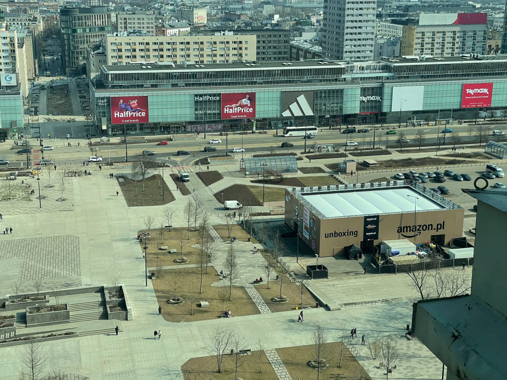 Wielkie pudło w centrum Warszawy – stolica wciąż nie ma zabezpieczenia przed takimi instalacjami. Jedna z międzynarodowych korporacji wynajęła na Placu Centralnym teren i obudowała go gigantycznym banerem ze swoim logo.