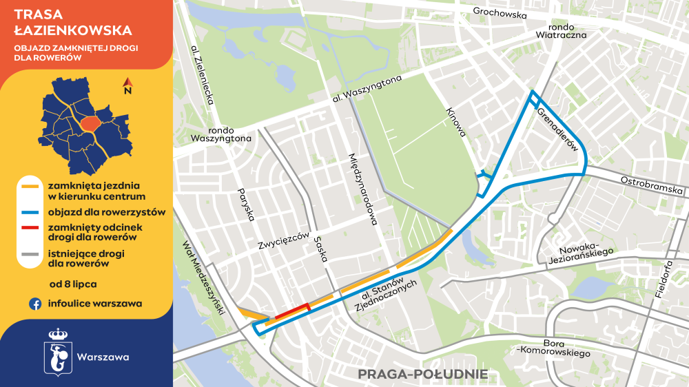 Z kolei rowerzyści nie będą mogli korzystać z drogi dla rowerów po północnej stronie al. Stanów Zjednoczonych na odcinku od zjazdu z kładki pod mostem Łazienkowskim do ulicy Wandy. Zamknięty będzie także przejazd pod wiaduktem przy ulicy Wandy. Tablice informacyjne będą kierowały rowerzystów na objazd drogą po drugiej stronie trasy i dalej ulicami Ostrobramską i Grenadierów.