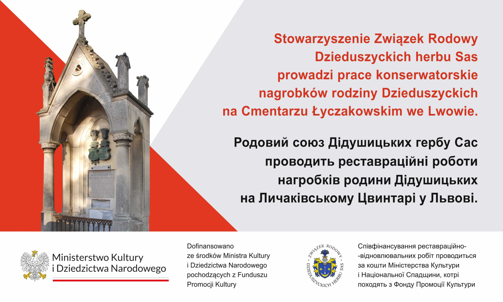 Mimo ogromnej pracy szczególnie muzealników, którzy nawet czasach ZSRR, jak i po upadku związku sowieckiego, w Ukrainie starali się zachować zbiory Dzieduszyckich, pozostałe poza granicami Polski, to jednak spuścizna rodu, znajdująca się współcześnie w Ukrainie, wymaga troski. Związek Rodowy Dzieduszyckich herbu Sas organizuje konferencje naukowe, wydaje opracowania, poświęcone spuściźnie rodu, ale od kilku lat zajął się również rodzinnymi grobami, głównie we Lwowie. Groby, sarkofagi czy kaplice poszczególnych członków rodu są bowiem nie tylko miejscem ich wiecznego spoczynku, ale także dziełami sztuki rzeźbiarskiej i kamieniarskiej. Warunki atmosferyczne, upływ czasu czy brak bieżącej opieki, spowodowały, że obiekty te wymagają renowacji. Uzyskując fundusze polskie z Ministerstwa Kultury i Dziedzictwa Narodowego oraz poprzez granty/konkursy Narodowego Instytutu Polskiego Dziedzictwa Kulturowego za Granicą POLONIKA, uratował lub przywrócił świetności już kilkanaście nagrobków. Co więcej, doświadczenia w tym względzie zostały docenione przez stronę ukraińską, która poprosiła o podjęcie się przez Związek Rodowy Dzieduszyckich herbu Sas odrestaurowania przepięknej rzeźby na narożniku kamienicy Szolc-Wolfowiczów we Lwowie, znanej jako rzeźba "Chrzest Chrystusa przez Jana Chrzciciela".