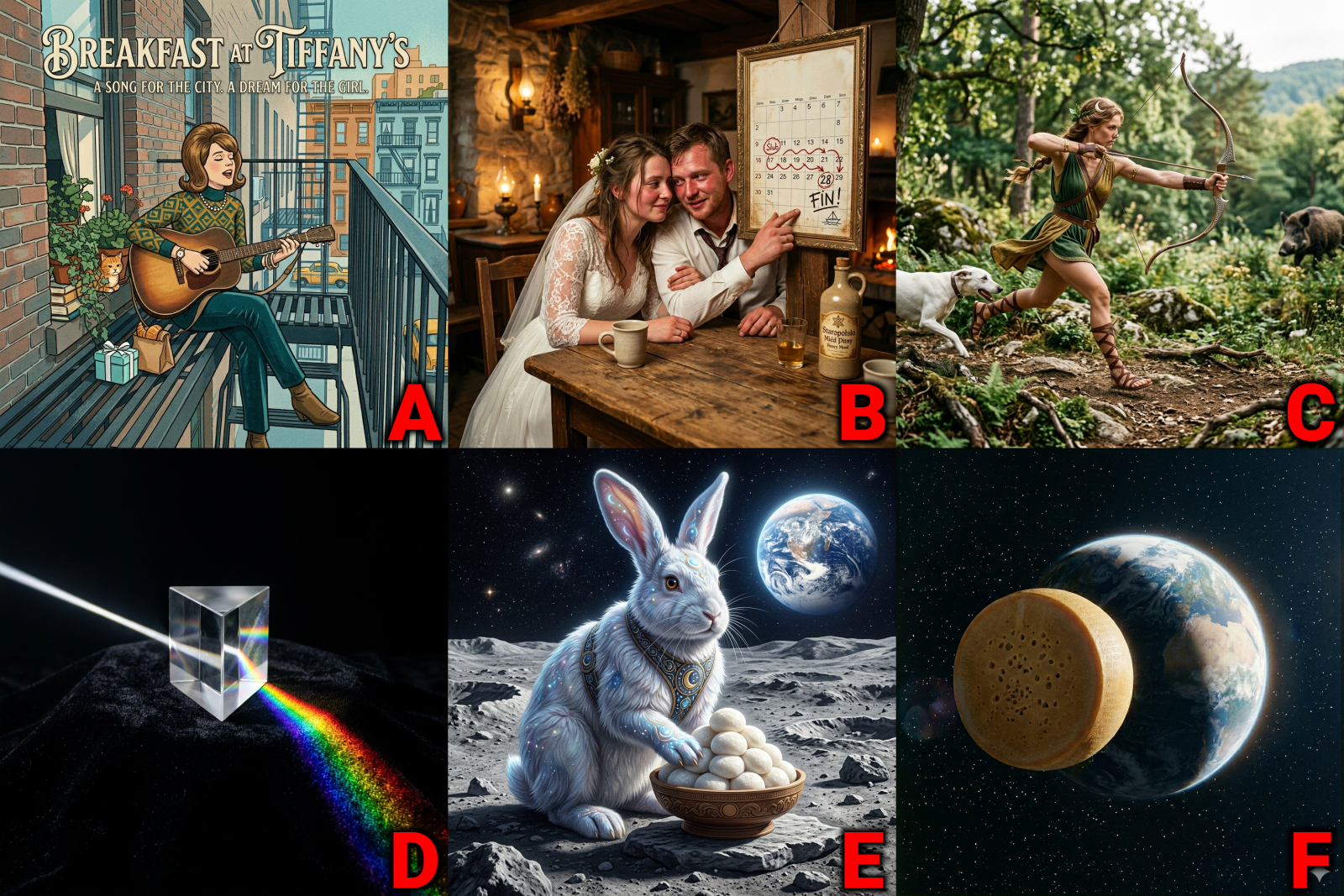 Dobra, trochę żeśmy się namęczyli, nie wszystkie bowiem skojarzenia sztuczna inteligencja uznała za prawomyślne. W końcu jednak – oto i są! Sześć ilustracji – od A do F – przedstawiających to, co się AI (i nam) skojarzyło z Księżycem. Państwa zadanie jest tutaj oczywiste – musicie odgadnąć, co się sztucznej inteligencji z Księżycem skojarzyło, no i oczywiście: dlaczego!